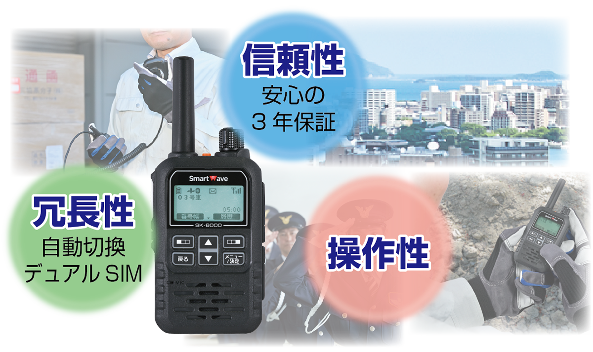 携帯電話のパケット通信網を利用するIP無線機は日本全国で広く利用することができます。スマートウェーブのIP無線機は発売以来、通信性能や堅牢性を重視した設計思想で、さまざまな業種で利用されています。SK-6000はその設計思想を継承しつつ、機能向上を実現しました。